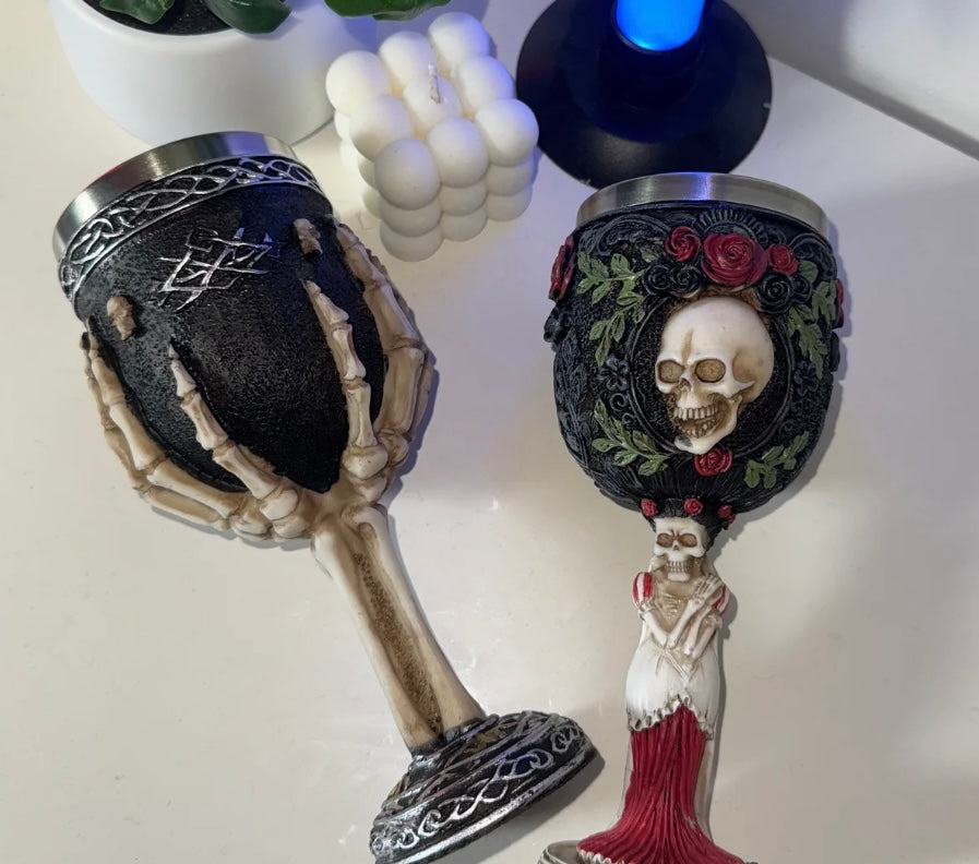With intricate skull details and skeletal hands, this goblet is the perfect companion for your next dark fantasy evening or themed party.